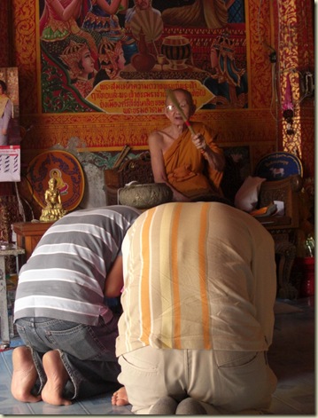 A monk giving blessings by dipping his bamboo wand into some sort of holy water and casting it out. I was the next in line to be blessed. Very cool, literally. It was a nice experience, but the best part was that I got absolutely soaked! It was steaming hot outside, so the cool-down was welcomed.